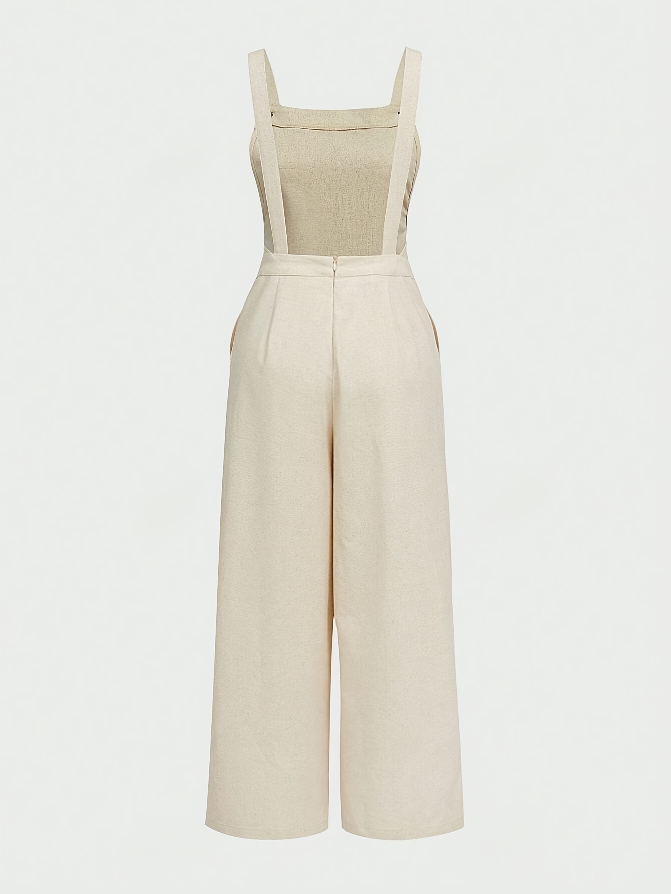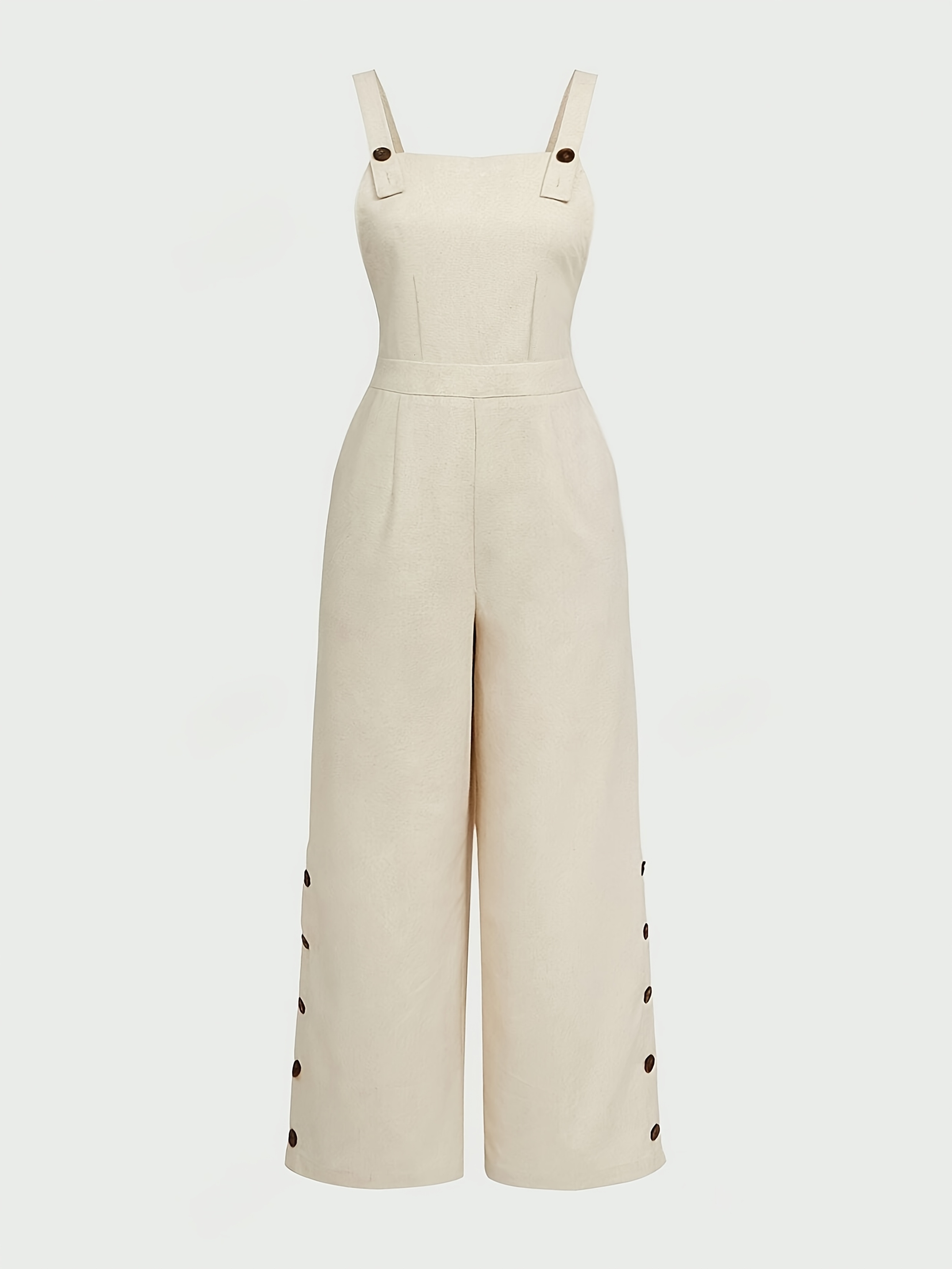Unleash your inner explorer! Beige linen jumpsuit. Adult sizes S-XL.