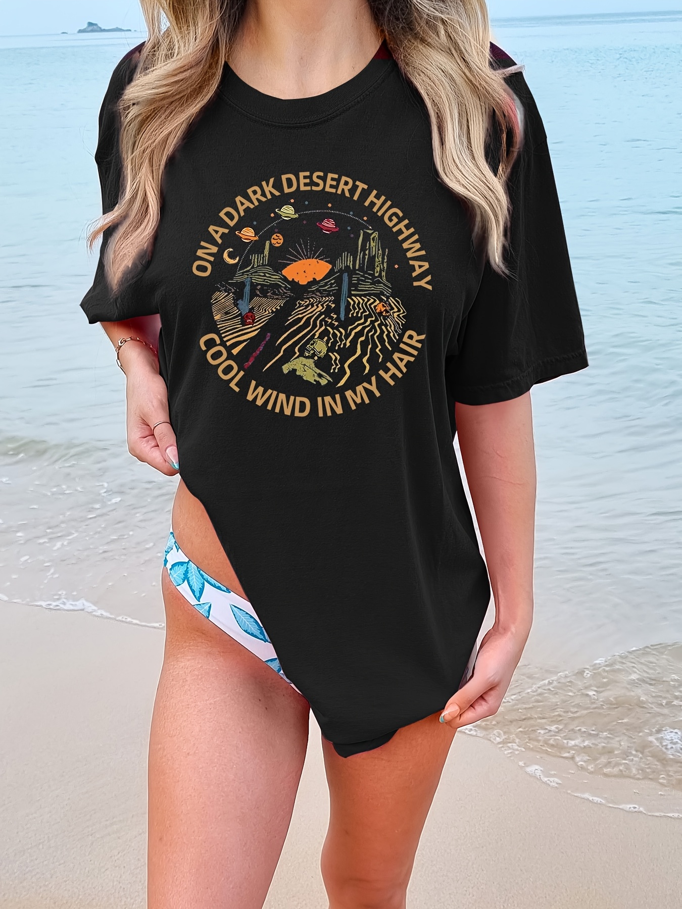 Unleash your inner wanderer! Bohemian Desert tee in apricot, black, or white. Sizes S-XXL. Perfect for the adventurous soul, ages 13+. A must-have for every free-spirited woman.